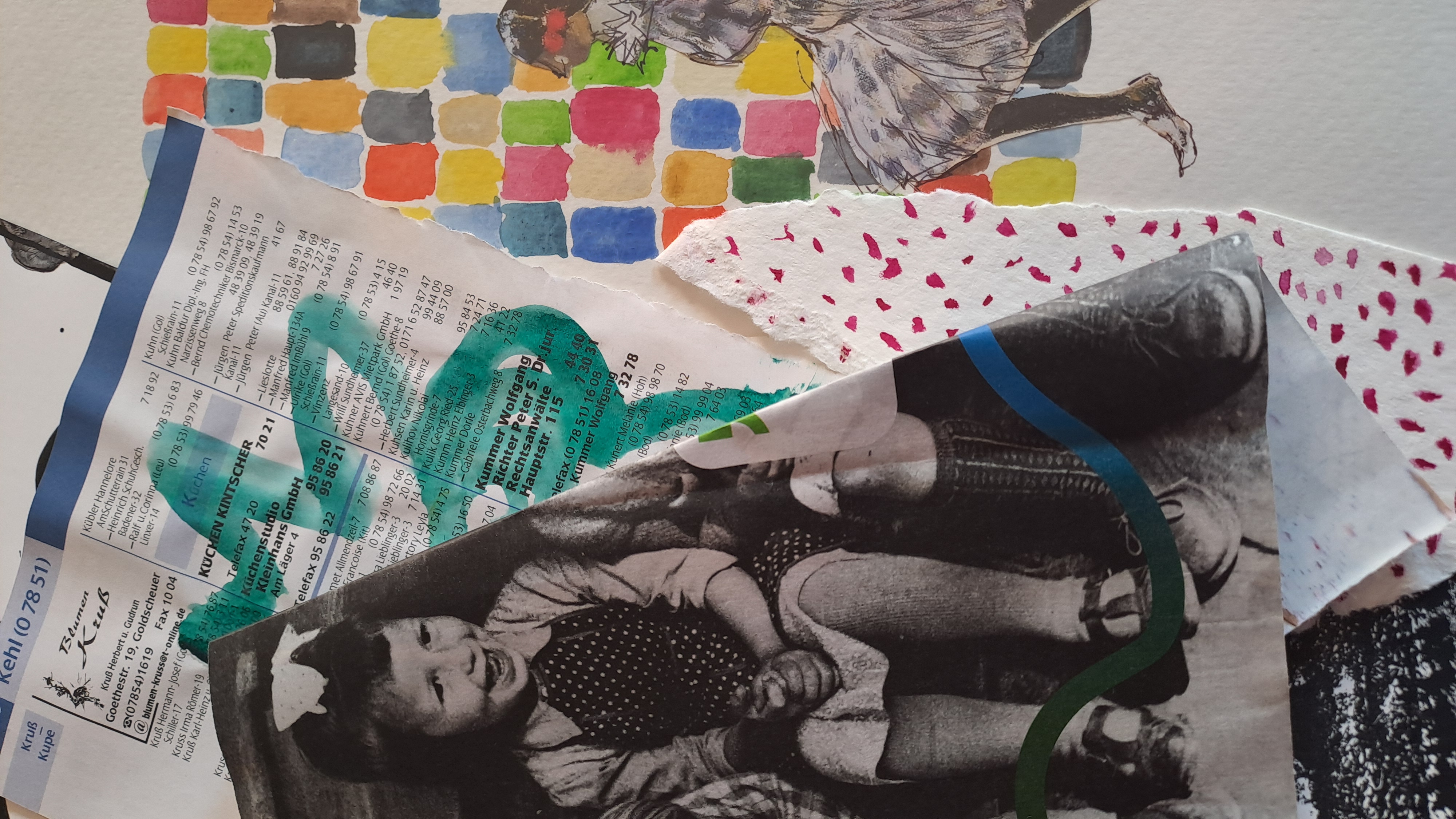 Wir gestalten auf gerahmten Holzplatten mit Hand-, Herz- und Kopfarbeit eine Collage oder Assemblage von unseren gesammelten Lieblingsstücken. Das können Fotos, Theater- oder Eintrittskarten, Stoffe, Spitzen oder andere flache Gegenstände sein, auch Naturmaterialien, die ihr bitte mitbringt. Papiere, die wir bemalen oder aus Zeitschriften ausschneiden, werden dazu verarbeitet. Wir schnippeln, montieren und kleben diese Stücke wie bei einem Puzzle zusammen. Es entstehen sehr persönliche Werkstücke im Quer- oder Hochformat, die wir mit Aufhängern versehen an die Wand hängen können.