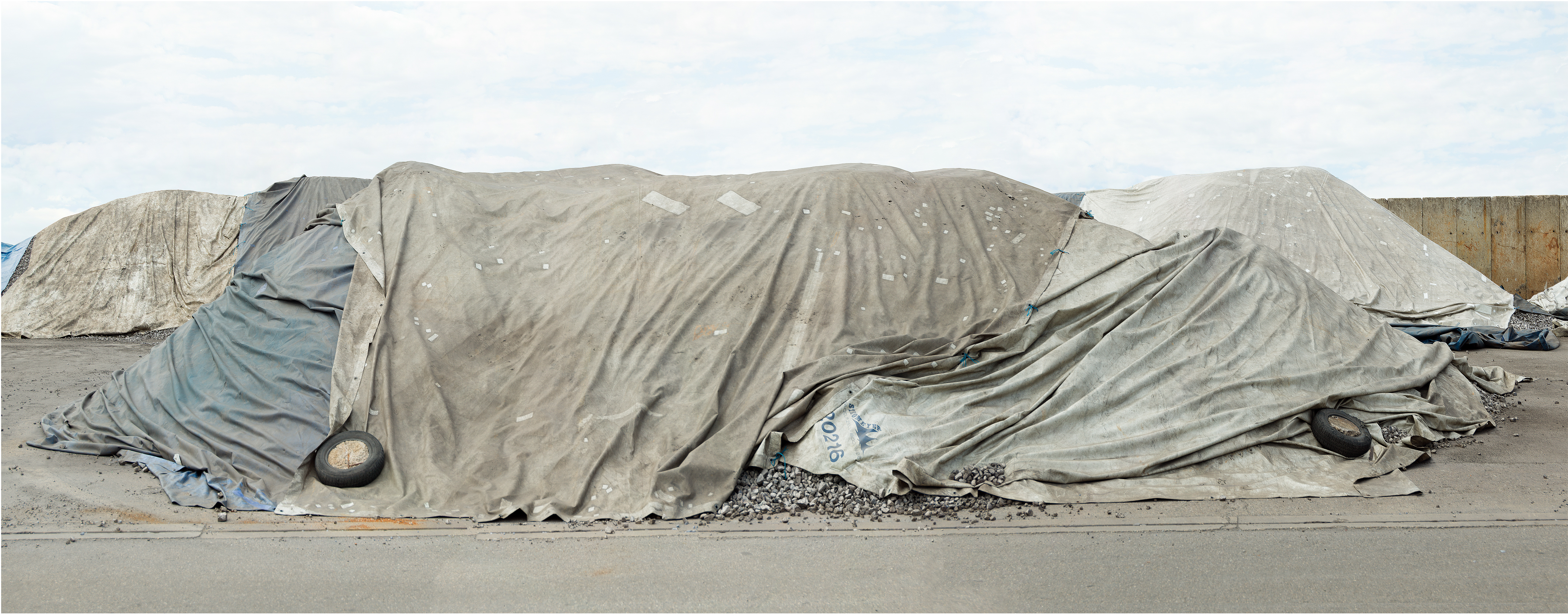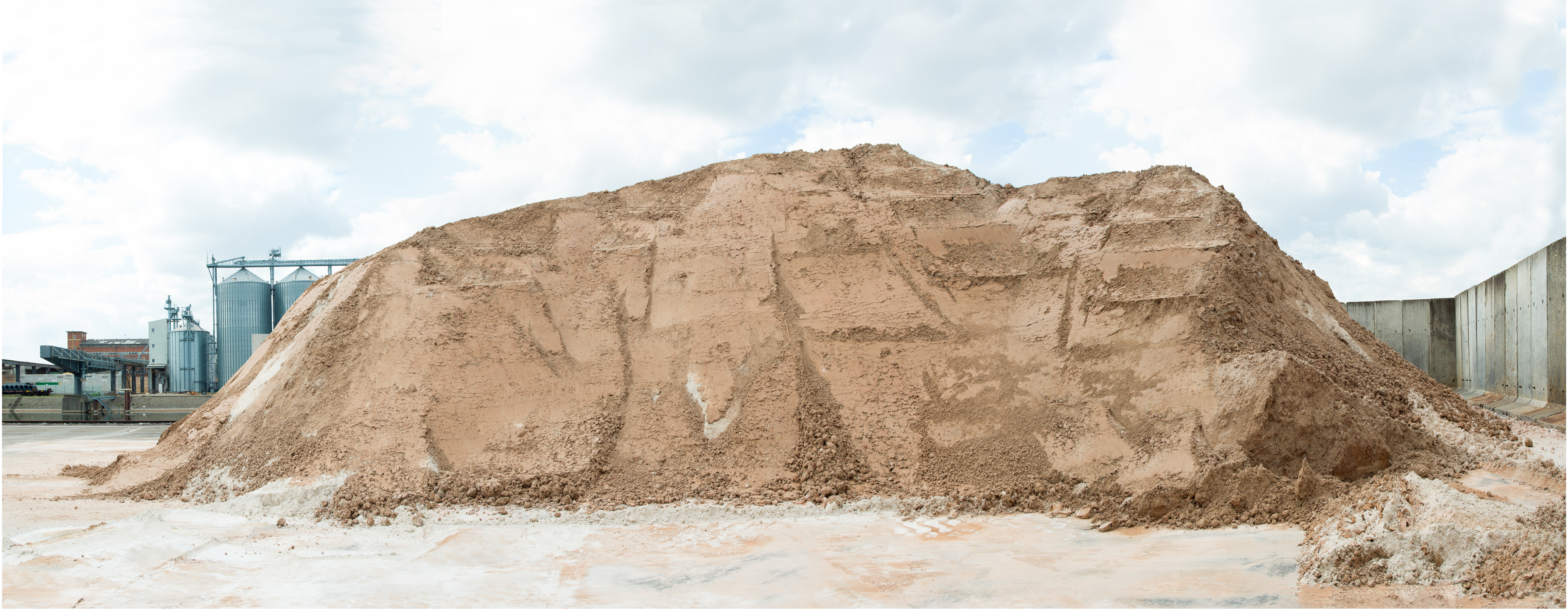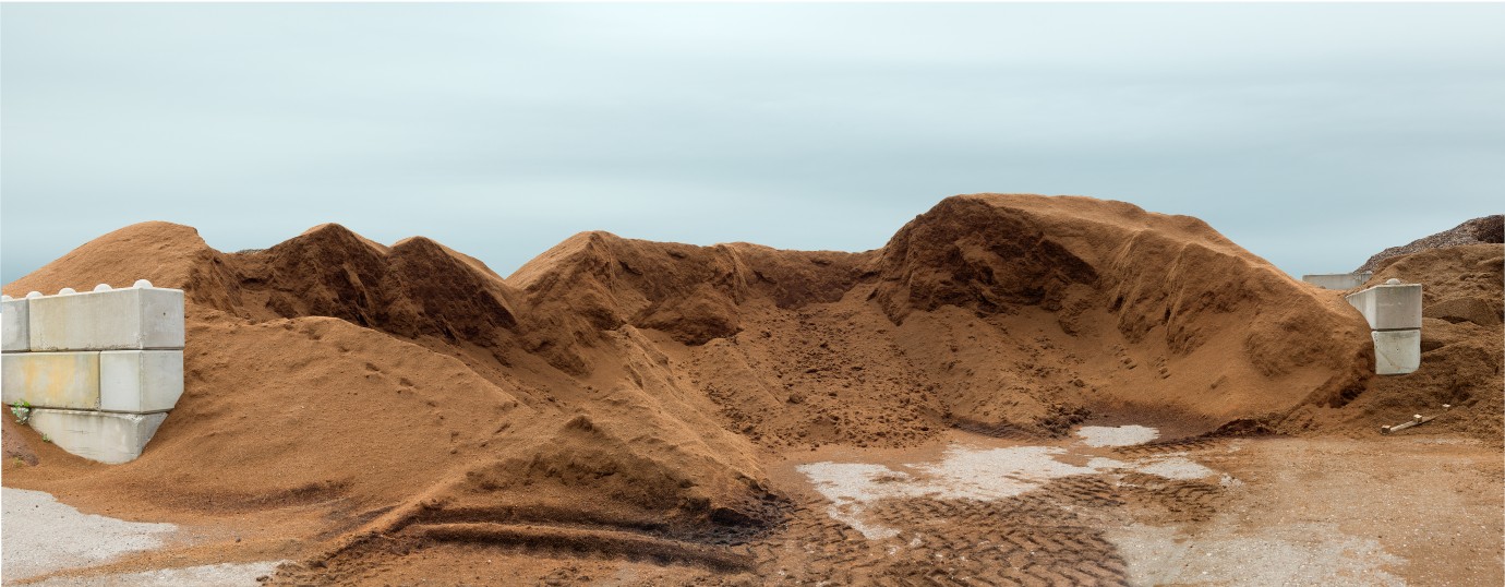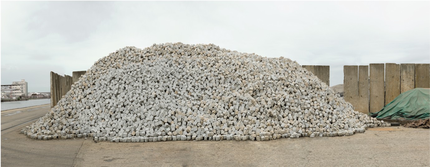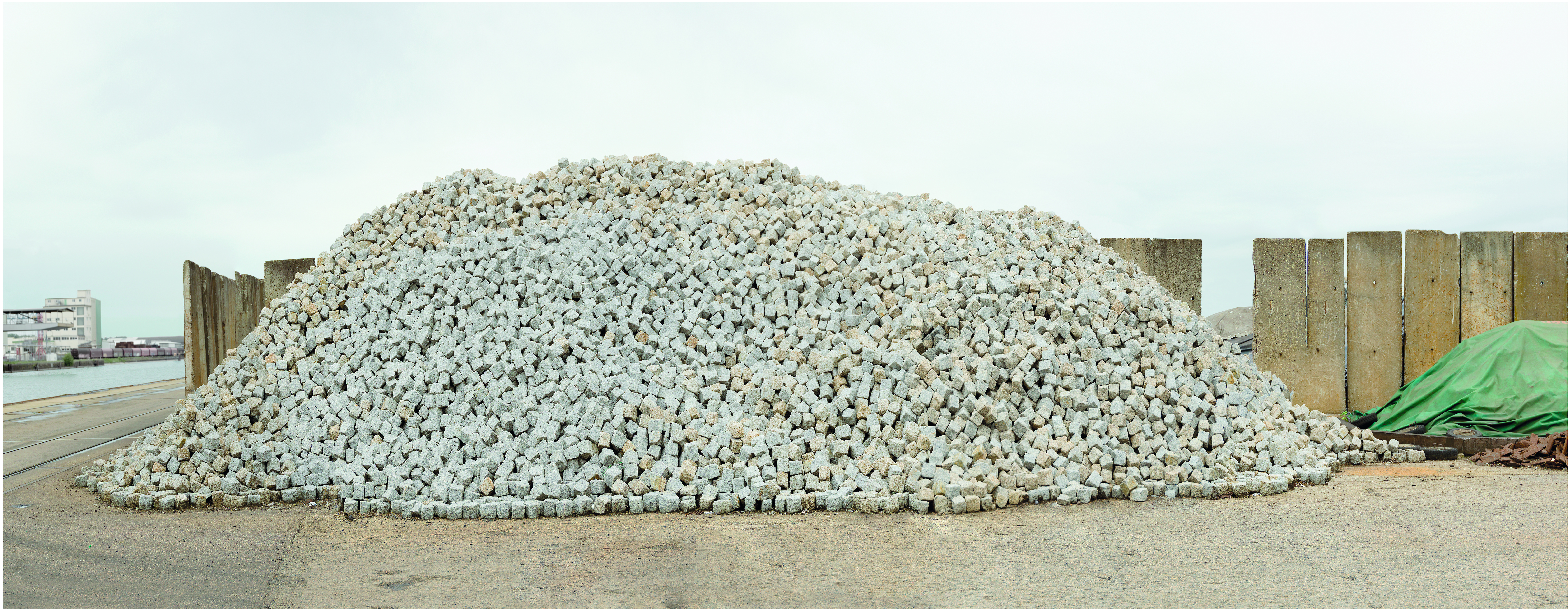 Modelling and photography – both aspects of sculpture and photography can be found in Gabriele Engelhardt's ‘Kehler Berge’ (Kehl Mountains). Piled up, shaped, layered, widened, narrowed, raised, worn away – with precision and maximum care, the port employees model each material with virtuosity, as if they were working in an open-air studio. Spat is extremely easy to shape. The material comes from the Black Forest and is used in paper production, among other things.