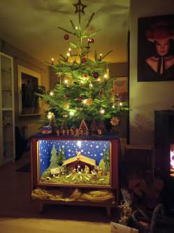 -stimmungsvoll mit Figuren vor einer beleuchteten Leinwand wird Euch die Weihnachtsgeschichte erzählt -